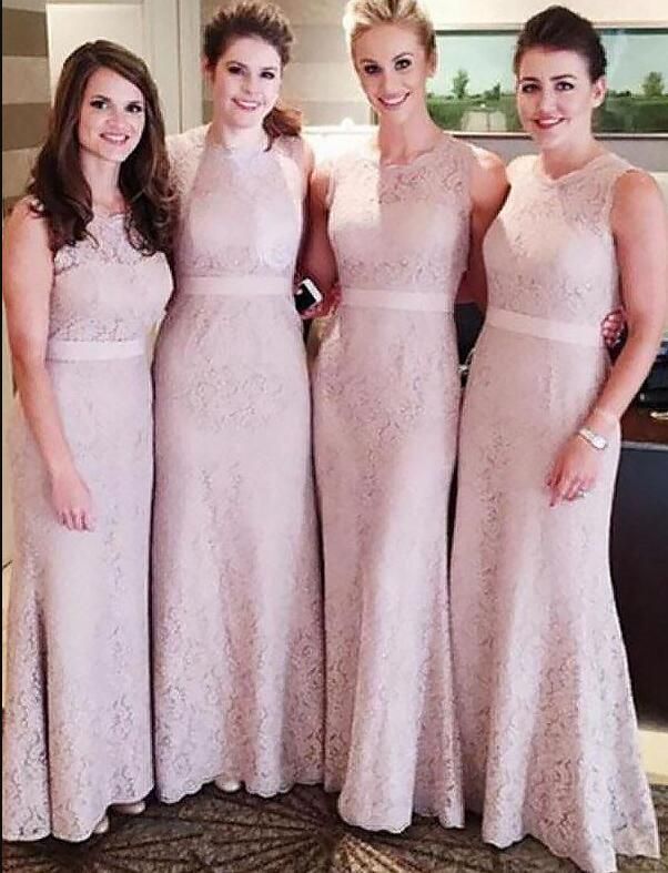 New Design Jewel Mermaid Light Pink Lace Bridesmaid Dresses Floor