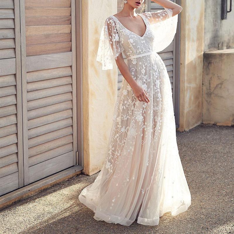 Boho Wedding Dress V Neck Elegant Sleeve Lace Beach Wedding Gown